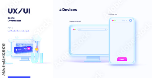Wall mural 3d toolkit-ui ux scene creator. part 4 application design. smartphone and desktop mockup with active