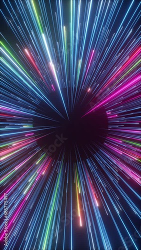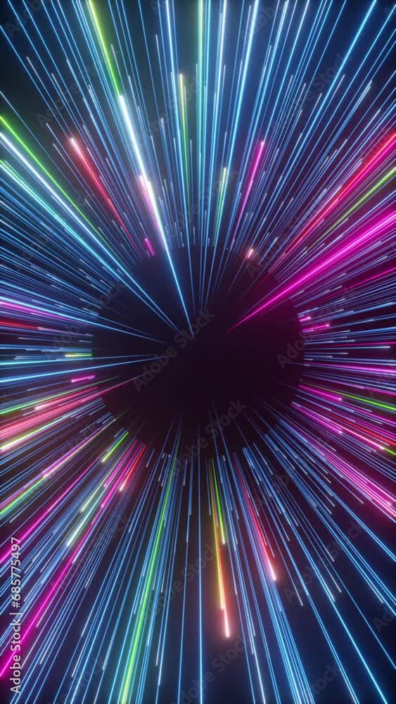 Wall mural : 3d vertical video, abstract colorful background of bright rotating neon stars and glowing lines - the