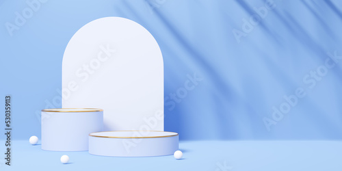 Wall mural 3d white cylinder podium with gold border, shadow palm leaf on blue arch and copy space background.
