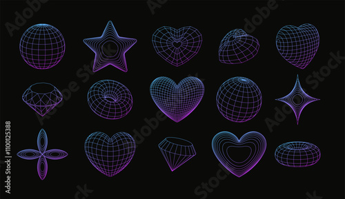 The watermark will not be included on Wall mural.: 3d wireframe shapes, perspective grid figures, tech mesh vector set purple gradient line elements, s