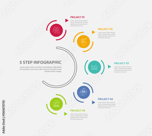 The watermark will not be included on Wall mural.: 5 points template infographic outline style with 5 point step template with circular object on half