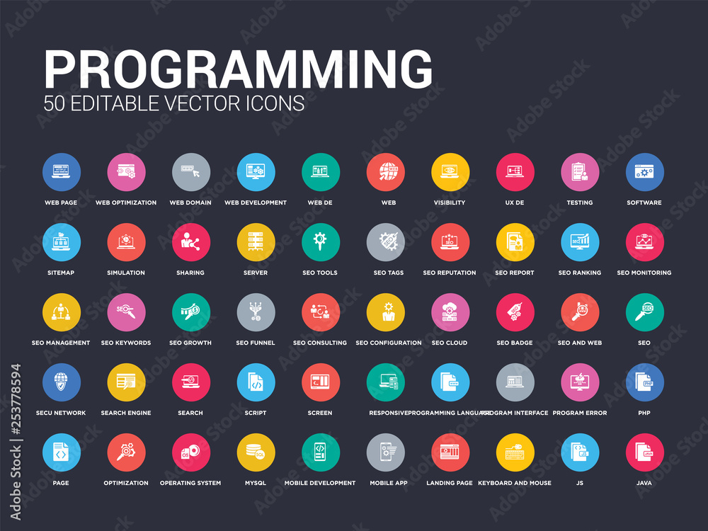Wall mural 50 programming set icons such as java, js, keyboard and mouse, landing page, mobile app, mobile deve - Wall murals Wall mural 50 programming set icons such as java, js, keyboard and mouse, landing page, mobile app, mobile deve - Wall murals
