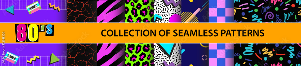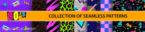 Wall mural 80's collection of seamless patterns | set of abstract vivid vector graphics in retro vintage style