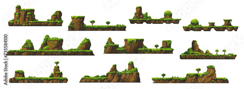 The watermark will not be included on Wall mural.: 8bit arcade pixel art game, rain forest and mountain jungle platforms, cartoon vector - arcade game e