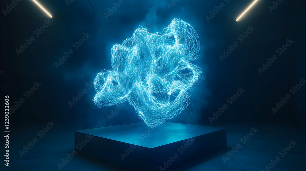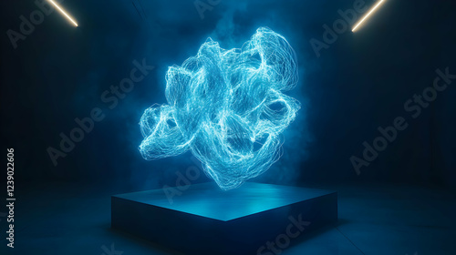 The watermark will not be included on Wall mural.: A 3d abstract sculpture with twisting neon cyan wires floating in a void
