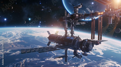 Wall mural a 3d depiction of a space station orbiting a planet, created with high-quality digital art in good q - Wall murals Wall mural a 3d depiction of a space station orbiting a planet, created with high-quality digital art in good q - Wall murals