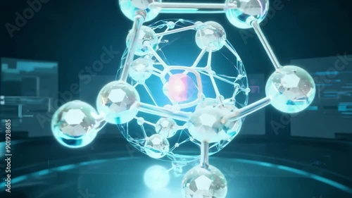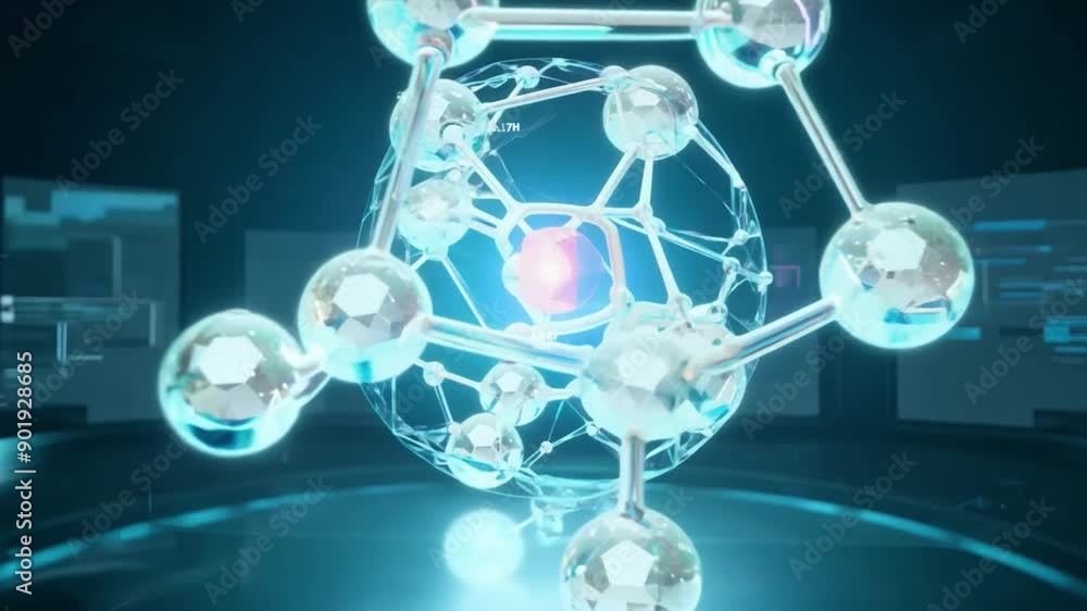 The watermark will not be included on Wall mural.: A 3d holographic model of an atom is displayed in a futuristic laboratory setting -