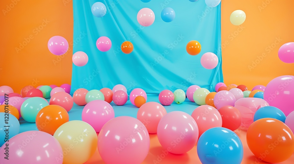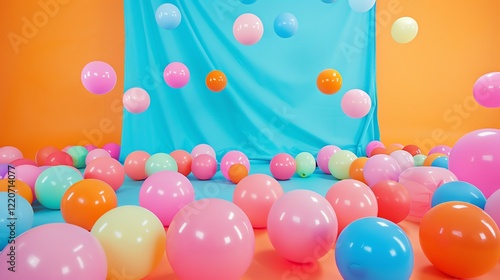 A 3d rendering of a colorful and playful scene with a blue cloth draped in the background and a buncWall mural