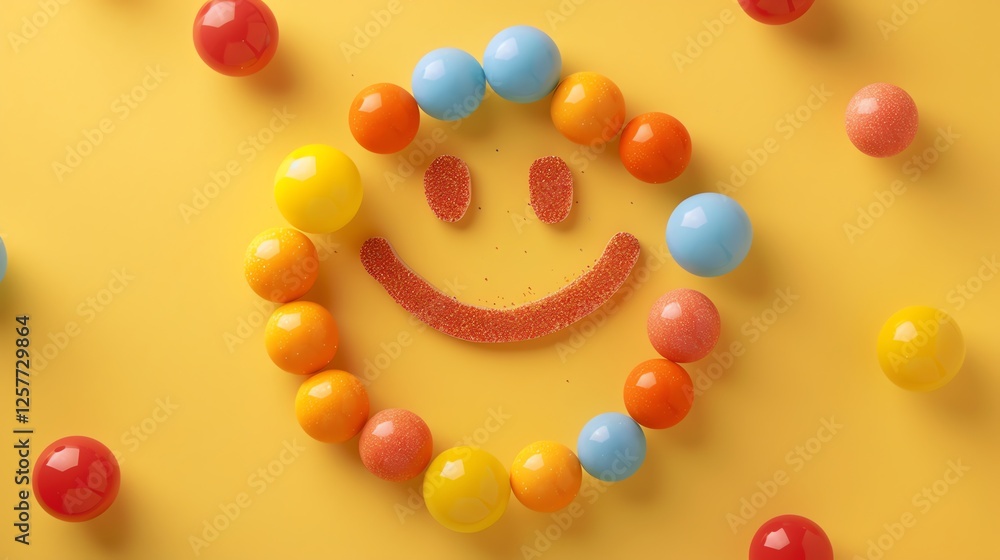 Wall mural a 3d rendering of a smiley face made of colorful balls on a yellow background. the balls are arrange - Wall murals Wall mural a 3d rendering of a smiley face made of colorful balls on a yellow background. the balls are arrange - Wall murals