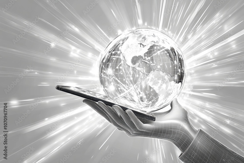The watermark will not be included on Wall mural.: A 3d transparent globe with lines and dots in the shape of the earth, with a hand holding a tablet c