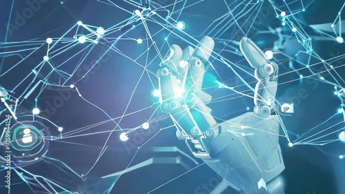 Wall mural a a futuristic robotic hand emerging from a complex digital network. glowing nodes symbolize connect