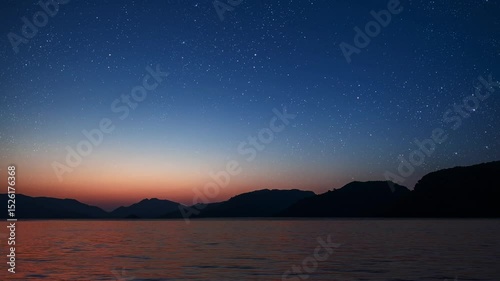 Wall mural : A a movement of stars in the night sky with the view of mountains -