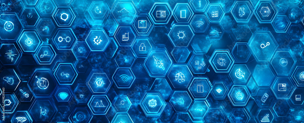 Wall mural a background of digital hexagons with icons representing data - Wall murals Wall mural a background of digital hexagons with icons representing data - Wall murals