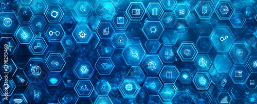 The watermark will not be included on Wall mural.: A background of digital hexagons with icons representing data