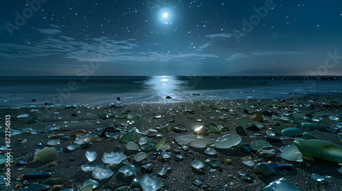 The watermark will not be included on Wall mural.: A beach at night with a full moon in the sky