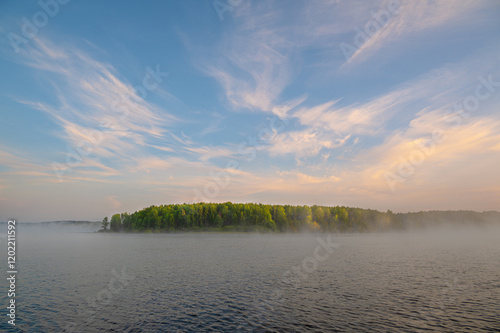 Wall mural a beautiful autumn morning landscape with a misty riverbank and a blue sky with pink clouds. - Wall murals Wall mural a beautiful autumn morning landscape with a misty riverbank and a blue sky with pink clouds. - Wall murals