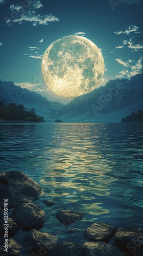 The watermark will not be included on Wall mural.: A beautiful landscape with a full moon rising over the mountains and reflecting on the lake