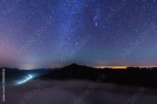 Wall mural a beautiful starry night in the mountains on top with beautiful scenery and fog.