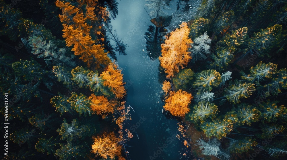 Wall mural a beautiful view of a river with trees on either side. the trees are in various stages of autumn, wi - Wall murals Wall mural a beautiful view of a river with trees on either side. the trees are in various stages of autumn, wi - Wall murals