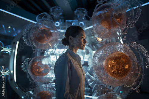 Wall mural a biotechnology researcher, face illuminated by the soft light from a computer screen, displaying a  - Wall murals Wall mural a biotechnology researcher, face illuminated by the soft light from a computer screen, displaying a - Wall murals