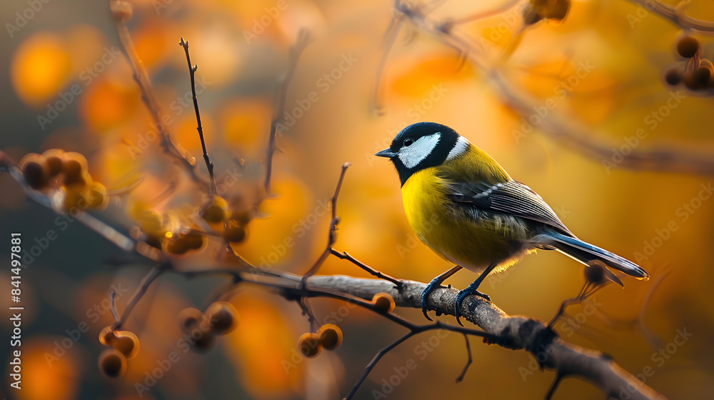 Wall mural a bird perched on a branch with a vibrant big bokeh in the background. shallow depth of field. beaut