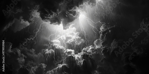 Wall mural : A black and white photo of a dramatic lightning storm, ideal for use in news or weather reports