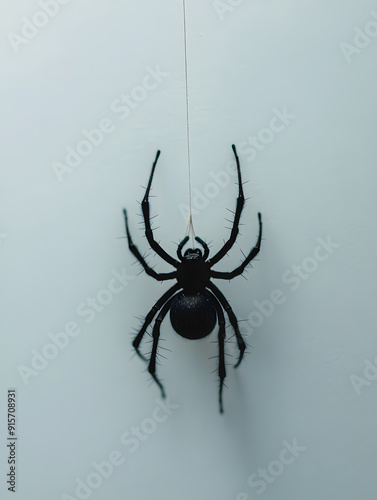 The watermark will not be included on Wall mural.: A black spider is hanging from string