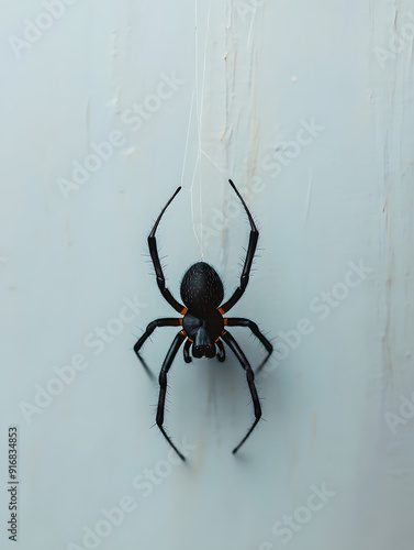 The watermark will not be included on Wall mural.: A black spider is hanging from string