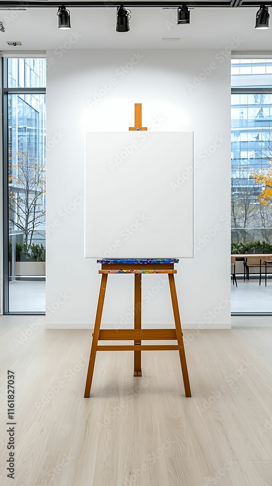 Wall mural a blank canvas on an easel stands in a bright, modern gallery space with large windows and a minimal - Wall murals Wall mural a blank canvas on an easel stands in a bright, modern gallery space with large windows and a minimal - Wall murals