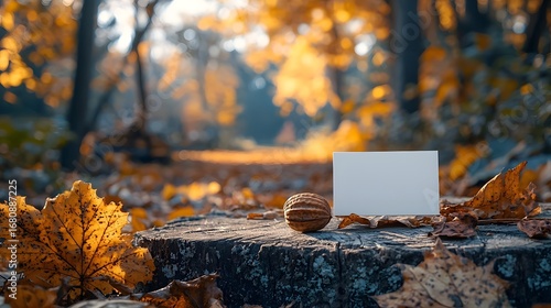 Wall mural a blank white card and a textured walnut rest on a rustic tree stump surrounded by vibrant autumn le - Wall murals Wall mural a blank white card and a textured walnut rest on a rustic tree stump surrounded by vibrant autumn le - Wall murals