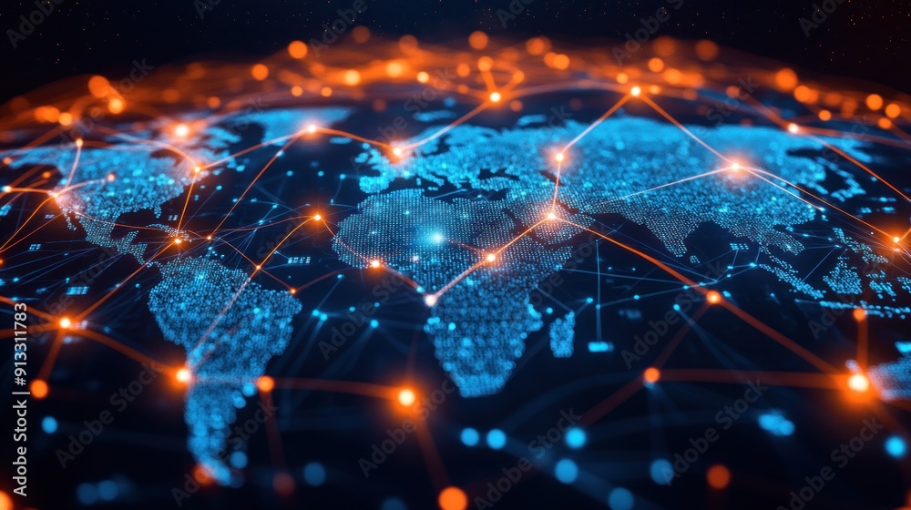 The watermark will not be included on Wall mural.: A blue and orange globe with many lines connecting it - the globe is surrounded by a network of lines