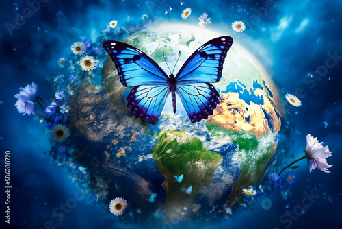 Wall mural a blue butterfly standing on planet earth, surrounded by flowers. peace, tranquility, serenity and n