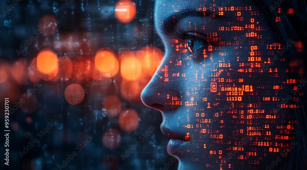 Wall mural a blue digital hacker with glowing binary code, ai in cybersecurity systems, threat detection algori - Wall murals Wall mural a blue digital hacker with glowing binary code, ai in cybersecurity systems, threat detection algori - Wall murals
