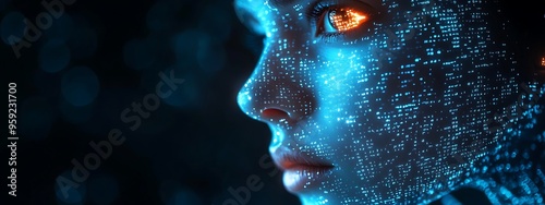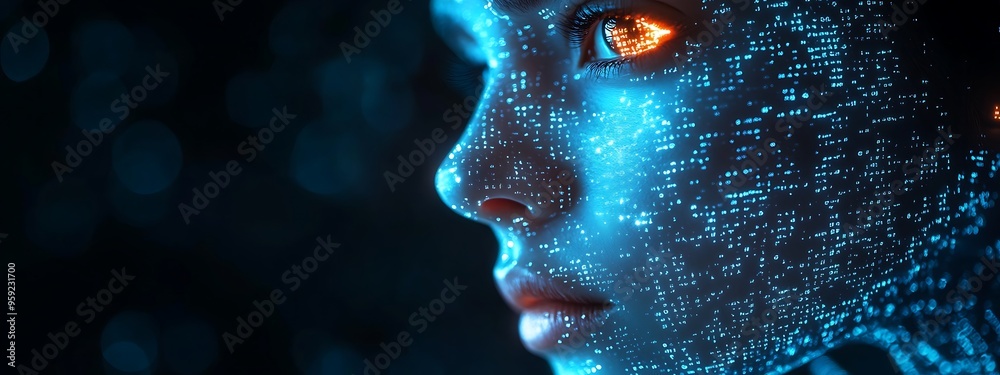 Wall mural a blue digital hacker with glowing binary code, ai in cybersecurity systems, threat detection algori - Wall murals Wall mural a blue digital hacker with glowing binary code, ai in cybersecurity systems, threat detection algori - Wall murals