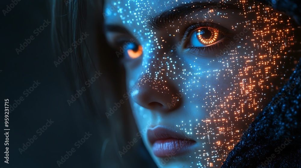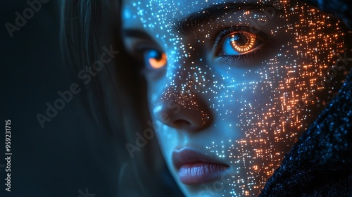 Wall mural a blue digital hacker with glowing binary code, ai in cybersecurity systems, threat detection algori - Wall murals Wall mural a blue digital hacker with glowing binary code, ai in cybersecurity systems, threat detection algori - Wall murals