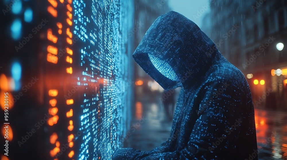 A blue digital hacker with glowing binary code, ai in cybersecurity systems, threat detection algoriWall mural