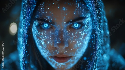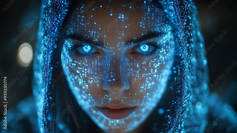 Wall mural a blue digital hacker with glowing binary code, ai in cybersecurity systems, threat detection algori