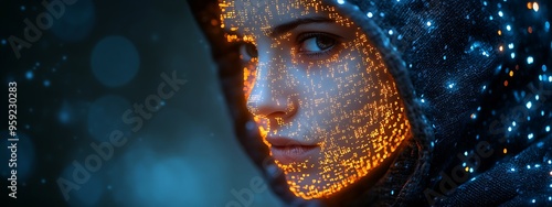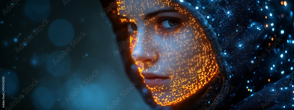 Wall mural a blue digital hacker with glowing binary code, ai in cybersecurity systems, threat detection algori - Wall murals Wall mural a blue digital hacker with glowing binary code, ai in cybersecurity systems, threat detection algori - Wall murals