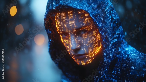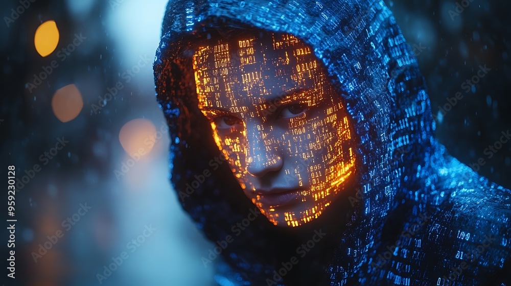A blue digital hacker with glowing binary code, ai in cybersecurity systems, threat detection algoriWall mural