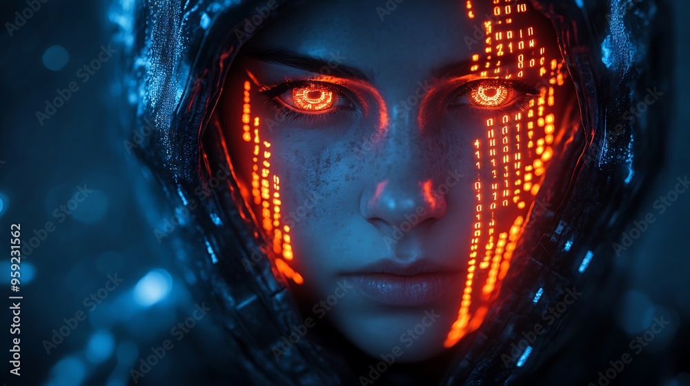 Wall mural a blue digital hacker with glowing binary code, ai in cybersecurity systems, threat detection algori - Wall murals Wall mural a blue digital hacker with glowing binary code, ai in cybersecurity systems, threat detection algori - Wall murals