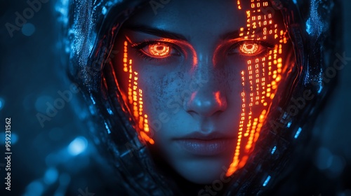 Wall mural a blue digital hacker with glowing binary code, ai in cybersecurity systems, threat detection algori