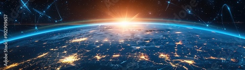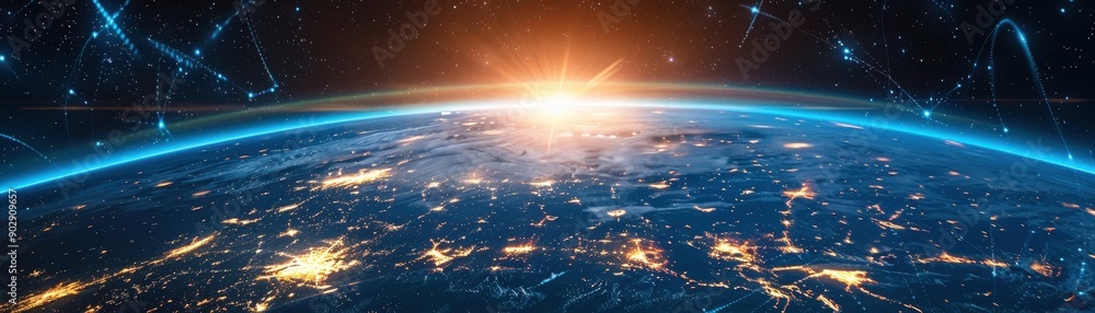 Wall mural a blue planet with a network of lines surrounding it. the planet is surrounded by a starry sky