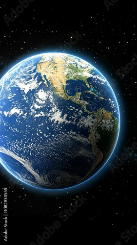 Wall mural : A blue planet with clouds and continents is visible in the vastness of space, surrounded by twinklin