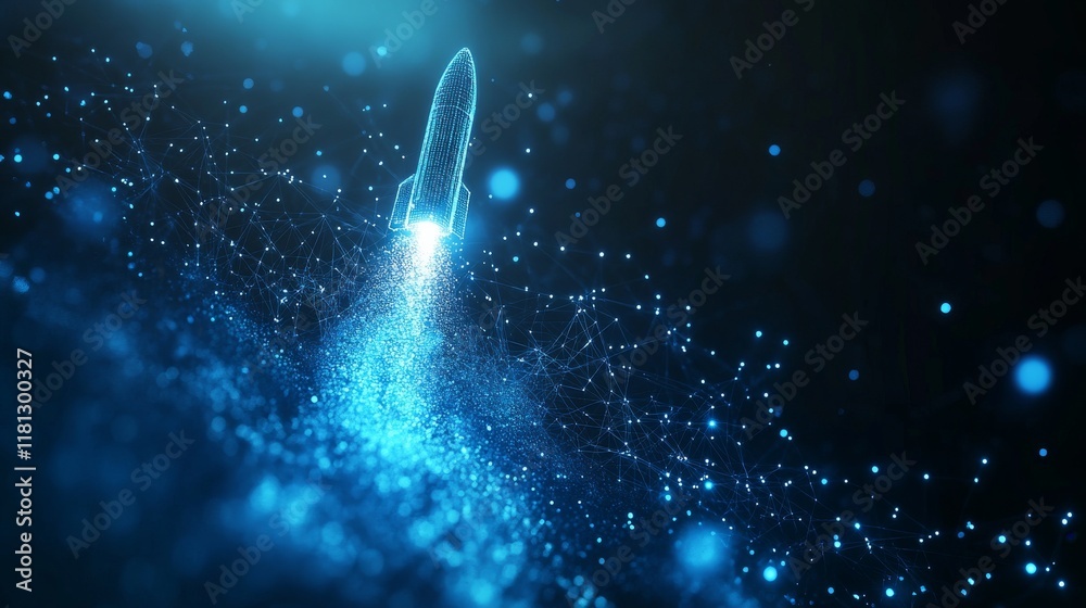 Wall mural a blue rocket soaring into the vast expanse of space, a polygon mesh with connecting dots and lines
