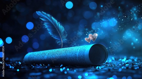 Wall mural a blue scroll with a feather and hearts on a dark background with bokeh lights. - Wall murals Wall mural a blue scroll with a feather and hearts on a dark background with bokeh lights. - Wall murals