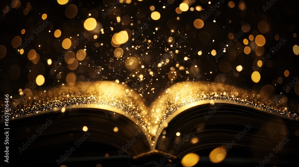 The watermark will not be included on Wall mural.: A bokeh light effect, where numerous small, soft circles of golden light appear to float against a d