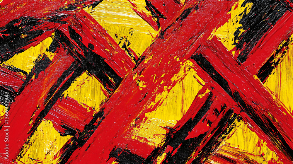The watermark will not be included on Wall mural.: A bold painting displaying striking red and yellow paints creating dynamic patterns under soft diffu