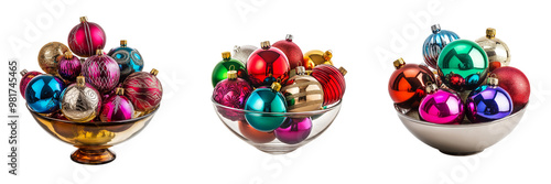 The watermark will not be included on Wall mural.: A bowl of colorful christmas ornaments in various shapes and sizes, isolated on transparent backgrou