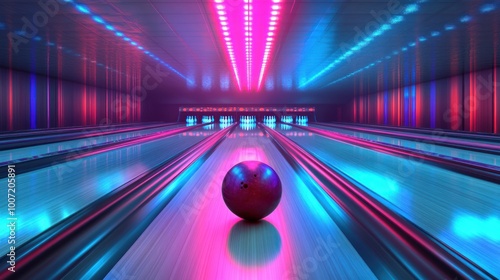Wall mural a bowling ball sits on a lane in a brightly lit bowling alley. the lane is illuminated by blue and p - Wall murals Wall mural a bowling ball sits on a lane in a brightly lit bowling alley. the lane is illuminated by blue and p - Wall murals