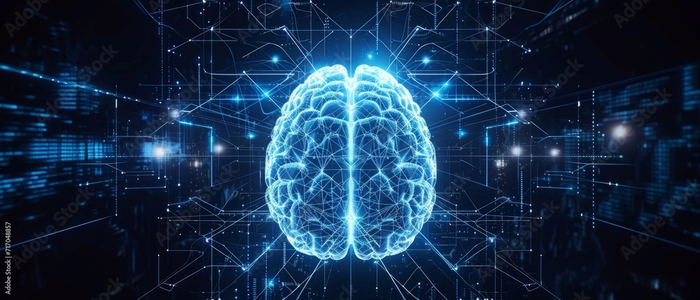 A brain with lights and symbols on a dark background generative aiWall mural